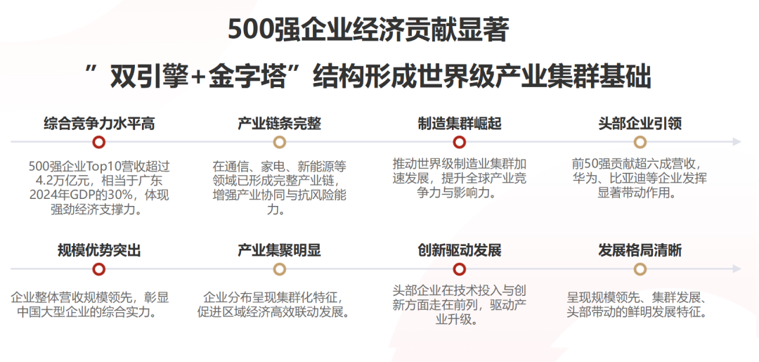 这份500强榜单不仅是广东省企业排名,更是中国经济从“世界工厂”向“全球价值锚点”跃迁的微观切片。通过对数据穿透分析,我们发现广东品牌已呈现出鲜明“双引擎+金字塔”结构,即以深圳和广佛为主力双擎拉动和产业分化及制造业龙头引领金字塔结构。