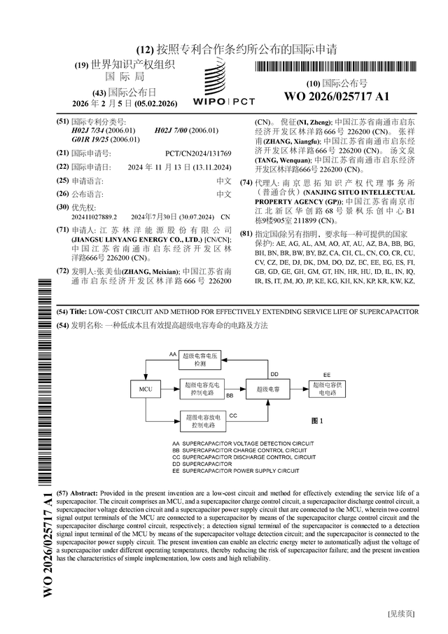 证券之星消息,根据企查查数据显示林洋能源(601222)公布了一项国际专利申请,专利名为“一种低成本且有效提高超级电容寿命的电路及方法”,专利申请号为PCT/CN2024/131769,国际公布日为2026年2月5日。