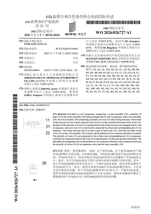 证券之星消息,根据企查查数据显示盾安环境(002011)公布了一项国际专利申请,专利名为“线圈部件”,专利申请号为PCT/CN2025/110963,国际公布日为2026年2月5日。