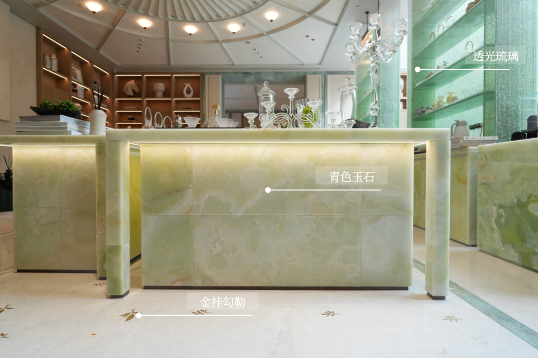 接待区、会所同样延续同意色系的青绿石材