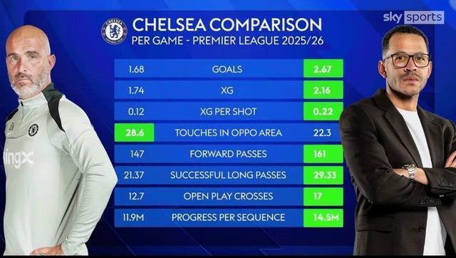 根据天空体育的统计,罗塞尼尔时代的切尔西在本赛季英超联赛中,进球、预期进球、每次射门的预期进球、向前传球、成功长传数、运动战传中、每次序列推进距离*等7项数据优于马雷斯卡时代,仅对方禁区触球数小于马雷斯卡时代。