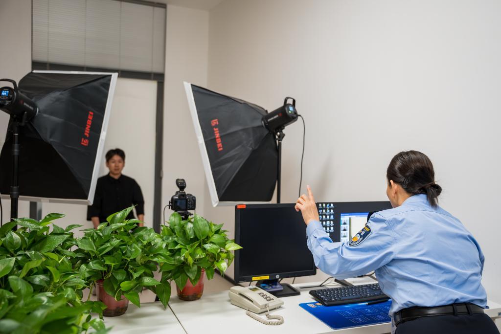 在合肥市政务服务中心公安综合窗口,工作人员为市民拍摄证件照。新华社发(胡金涛 摄)