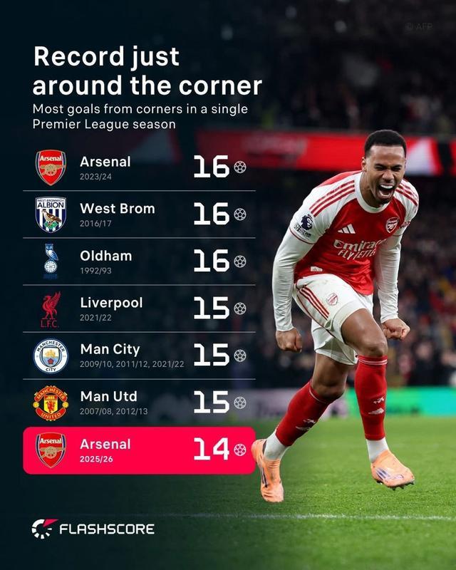 目前,阿森纳只需再打进2粒角球进球,就能追平这一项由他们创造的联赛纪录。
