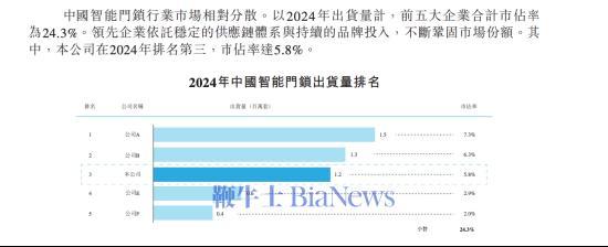 据招股书显示,2024年该公司在中国内地的智能锁出货量达到120万套,位列第三,市场占有率为5.8%。而排名第一的企业在该年度出货量为150万套,市场占有率为7.3%。