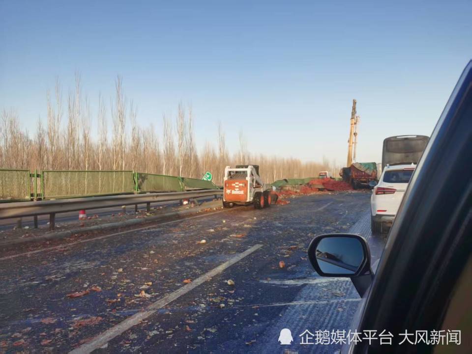 2月7日下午1点半左右,G6京藏高速临河至包头方向发生一起事故,一辆满载洋葱的货车突然失控,撞向路中间的隔离,车上的很多洋葱都洒落在路面上。