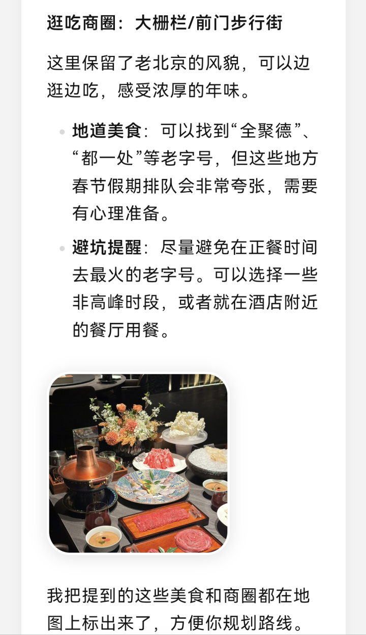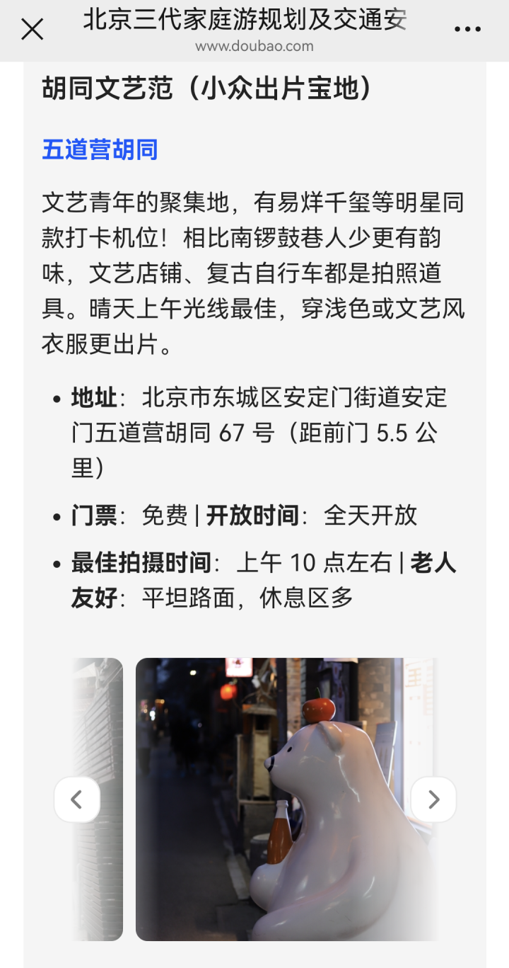 至于谁更懂谁?周欢欢问过全家人的想法,豆包用“铛铛车运营时段”“网红餐厅避开高峰的时间点”等细节俘获了她和爱人;程心AI以“茶馆听评书”拨动了两位老人的心弦;点点和圆周旅迹凭“小众目的地打卡”成为她和孩子的灵感库。飞猪问一问的方案略显“电商思维”,但推荐的中国科技馆,虽不属于中轴线景点,也让孩子有不少收获。