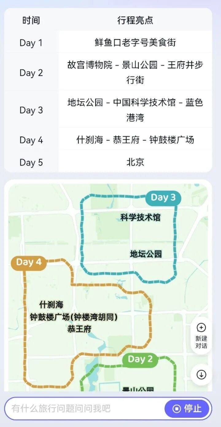 豆包支持生成表格和可视化网页,面对跨城市、多景点、涉及交通换乘的复杂行程时,它的优势就是将原本需要反复解释的安排,压缩成清晰的行程单。“我一看就知道哪天去哪儿,几点出门,甚至如何避坑。”李丽说,“这样心里就有数多了。”