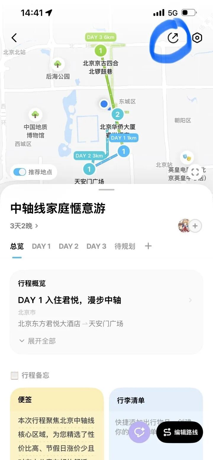 而圆周旅迹成了全家的“旅游搭子”。周欢欢生成初版行程后,将链接甩进微信里的家庭群,大家一起“连机”修改行程,这样就不用挤在一个屏幕上了。而且AI还能自动在地图上生成线路图。不仅如此,圆周旅迹还有行李清单和行程备忘录的功能设置。李丽在“行李清单”里勾选“老花镜、降压药”;女儿用语音输入“要吃冰糖葫芦!”……