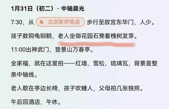 “因为AI提供的内容是总结来的,不是实地走出来的。行程真正落地,是否真的能在景山万春亭‘自然获得’30分钟安静时间?是否真的能在前门网红餐厅实现‘排队小于20分钟’?AI无法保证。”李丽说,当她看到AI建议她和老伴坐在故宫御花园石凳看槐树发芽时,笑得直不起腰来。