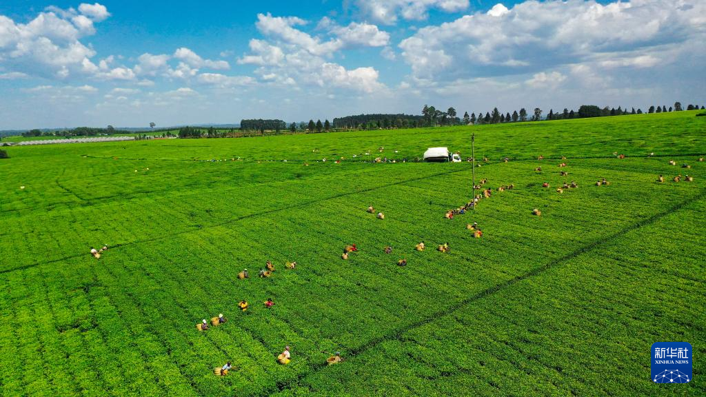 2月4日,在肯尼亚西部的博梅特郡,茶农在一处茶园采茶(无人机照片)。
