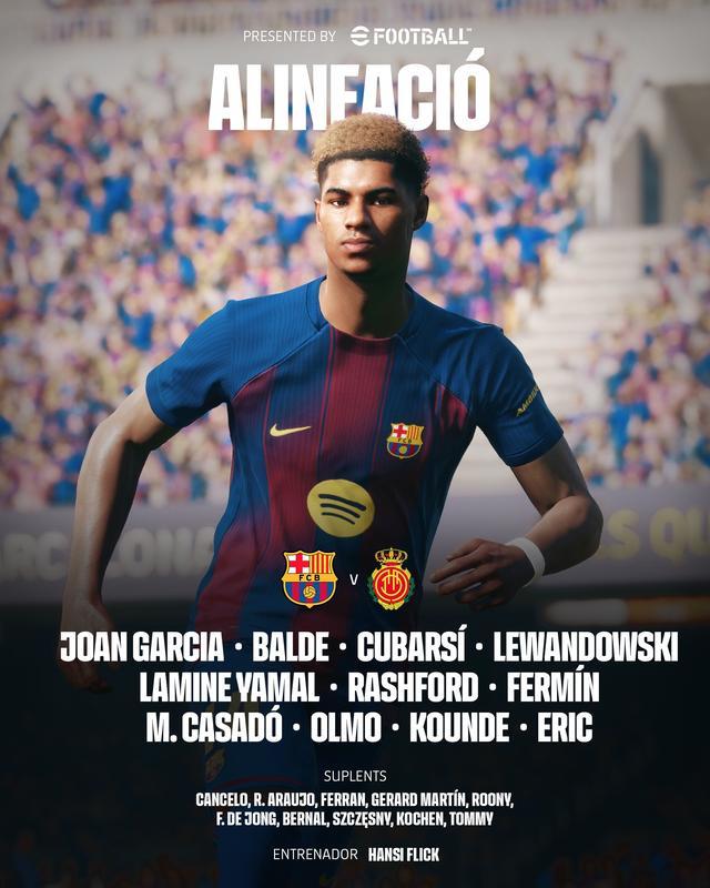 巴萨首发:13-霍安-加西亚、3-阿莱士-巴尔德、5-库巴西、24-埃里克-加西亚、23-孔德、17-卡萨多、16-费尔明-洛佩斯、20-奥尔莫、9-莱万多夫斯基、10-亚马尔、14-拉什福德