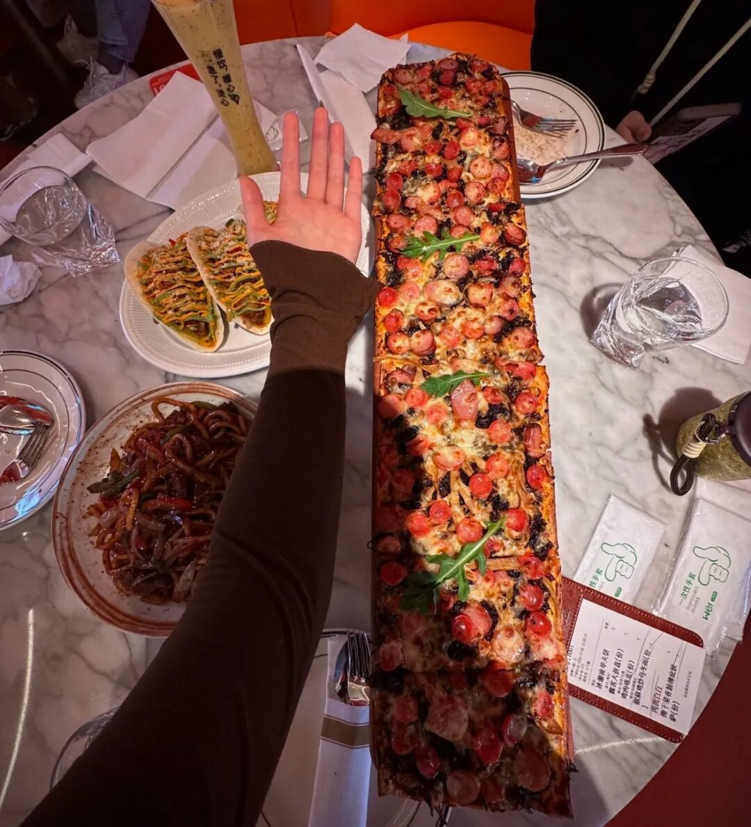 在魏客咖啡点一份39块的披萨,菜单上的名字只叫长舌头,让人顶多觉得是个长方形的比萨。结果上菜后发现披萨比我胳膊都长,三个人啃了半天才只吃完一半。”