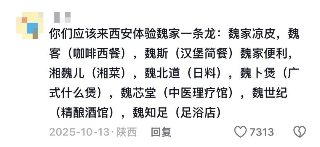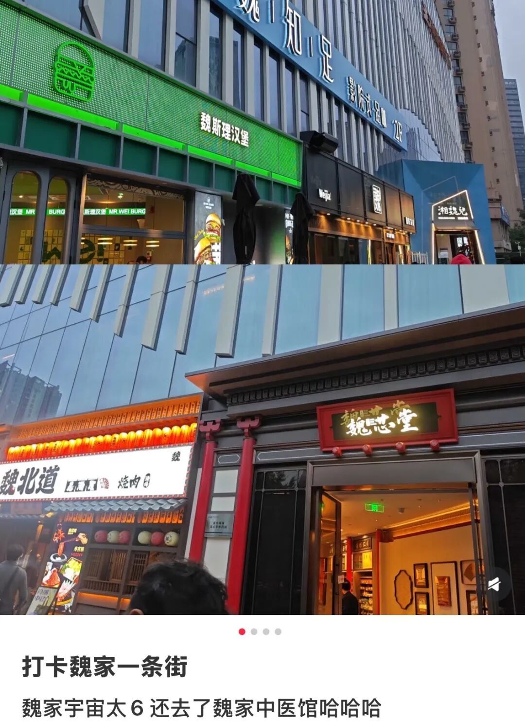 “魏家宇宙占据了西安一整条街的店面,你一走进去,先是会被魏家凉皮的黄油汉堡坯的香味迷晕,再被湘魏儿湘菜馆的辣椒味勾了魂儿,等到你肚子已经装满、进入晕碳状态后,就该去魏知足里做个脚底按摩了。”