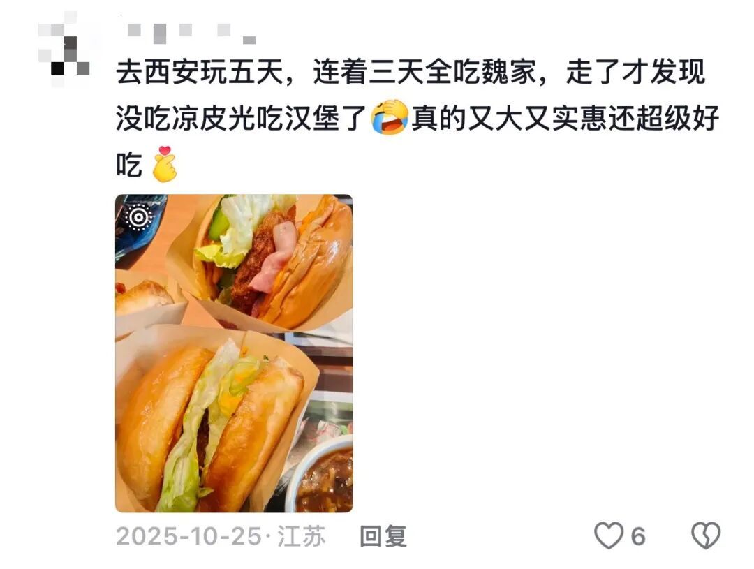“前有魏家凉皮的汉堡和卤肉饭成了年轻人的穷饱餐,据说只要不吃凉皮就永远不会踩雷;后来魏家凉皮单独的汉堡店魏斯理又全网爆火,口味和价格吊打肯德基和麦当劳。”