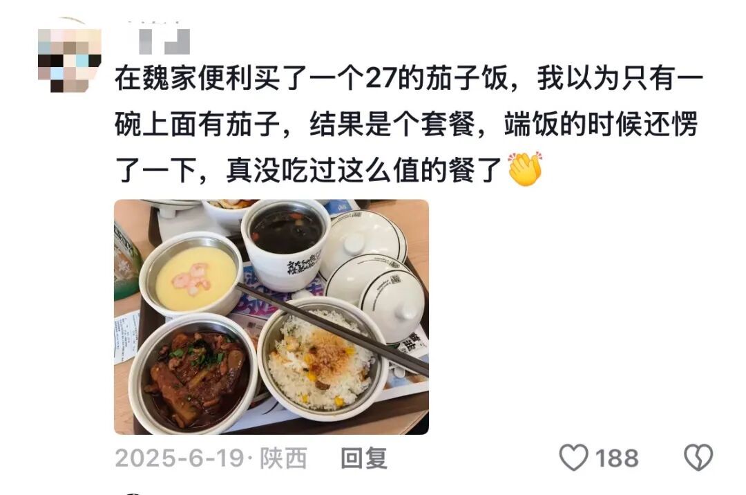 甚至仅仅是去魏家便利店里买个盒饭,也会被这种超高的性价比震撼到。“点魏家便利店的茄子饭,本来二十多块钱的价格,以为只有一份饭,后来却发现是一大份套餐,包含米饭、汤和蒸鸡蛋,而且米饭还可以无限续,分量大到能让人吃到力竭。”