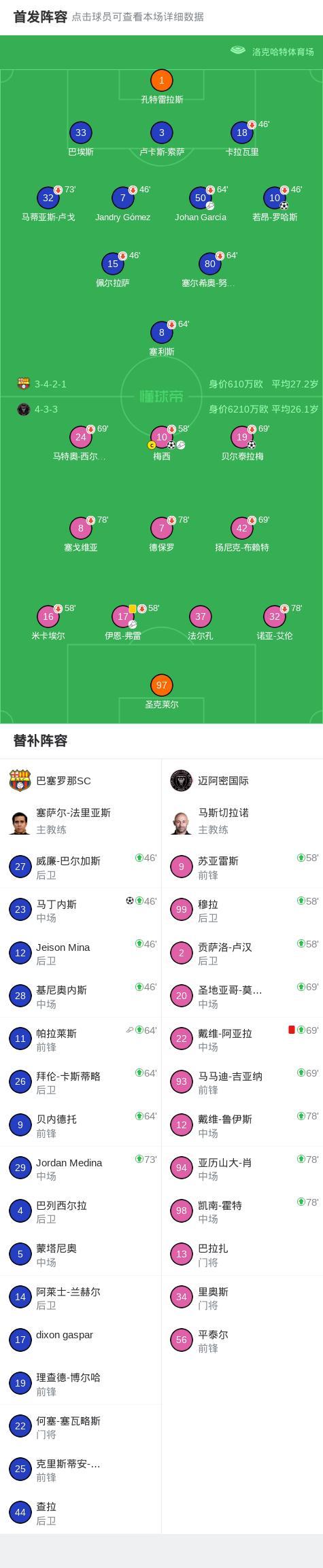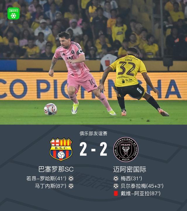 北京时间2月8日俱乐部友谊赛,巴塞罗那SC对阵迈阿密国际。巴塞罗那SC若昂-罗哈斯破门,马丁内斯破门。迈阿密国际梅西破门,贝尔泰拉梅破门。最终比分巴塞罗那SC 2-2 迈阿密国际。
