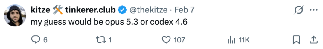 很多人猜测要么是 Claude 新模型(Opus 5.3)、要么是 Codex 新模型(4.6)。