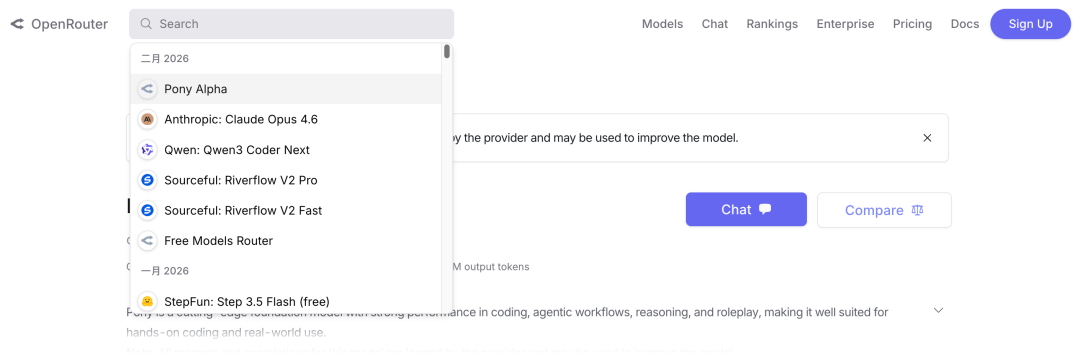 这个匿名模型叫做「Pony Alpha」。根据 OpenRouter 官方的说法,它是新一代的通用大模型,在编程、逻辑推理和角色扮演方面表现突出,并针对 Agent 工作流进行了优化,具有极高的工具调用准确率。