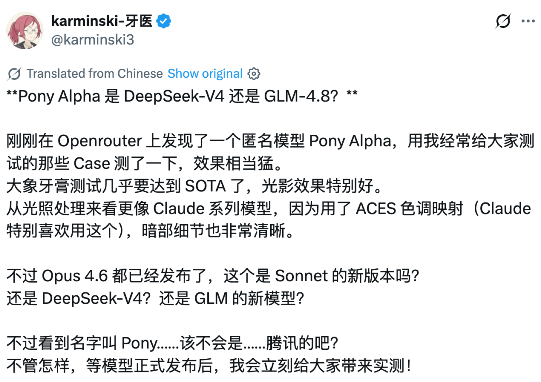 知名 X 博主「karminski - 牙医」猜测 Pony Alpha 是国产大模型,要么是 DeepSeek-V4,要么是 GLM 新模型。