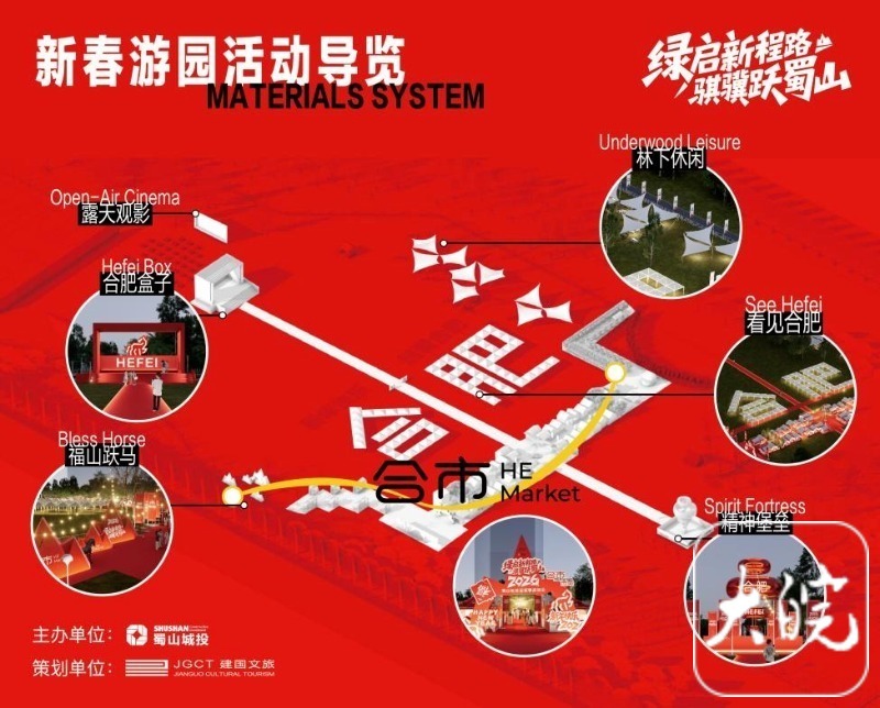 活动主题为“绿启新程路,骐骥跃蜀山”,通过注入文化体验与消费新场景,把皖韵民俗与未来科技、光影艺术与年轻潮流完美融合,实现文商旅体的深度融合与相互赋能。活动时间为:2月8日14:00-21:00、2月9日-12日 15:00-21:00、2月27日-3月3日 11:00-21:00。
