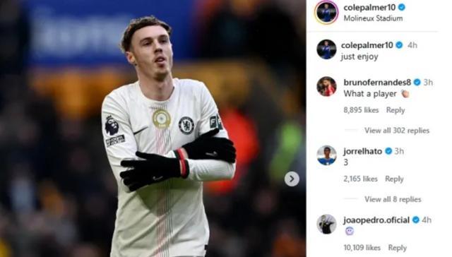 在帕尔默代表切尔西对阵狼队上演帽子戏法、帮助球队3-1取胜后,曼联队长布鲁诺-费尔南德斯对其大加赞赏。