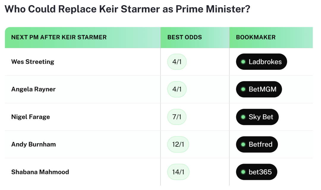 ● 博彩公司公开新首相赔率榜,雷纳、斯特里廷最可能接班斯塔默