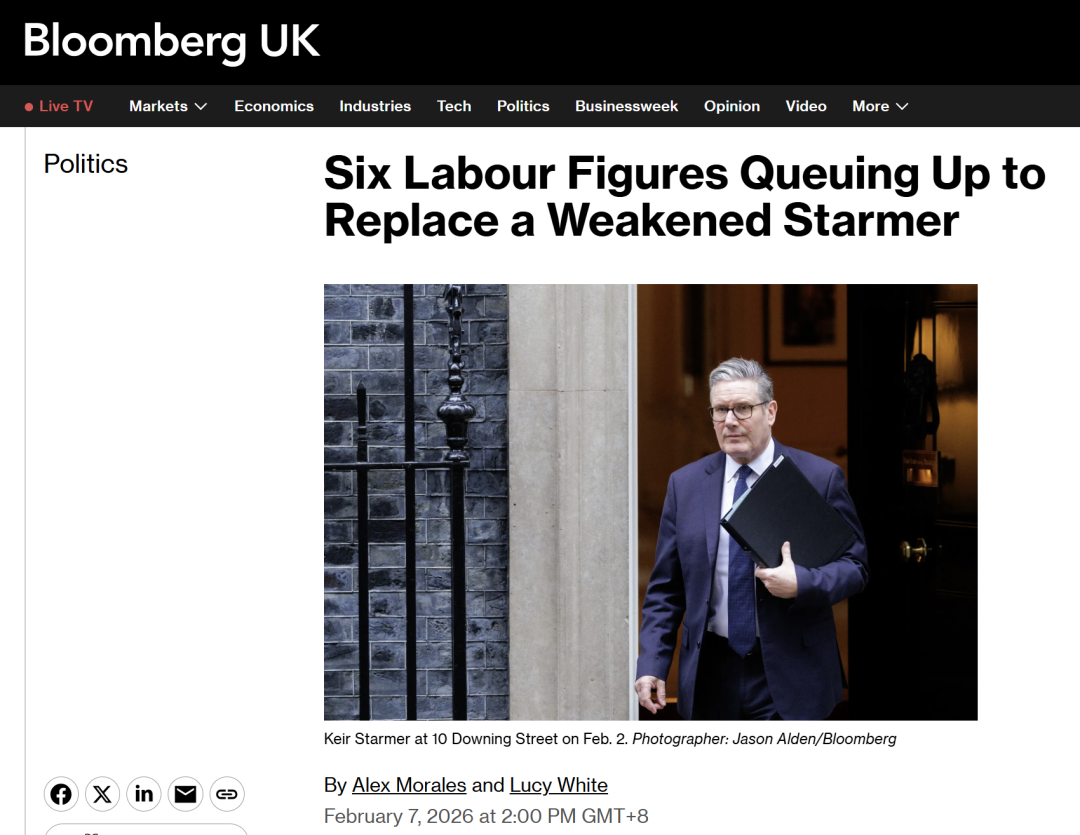 2月7日,《彭博社》列出了6位可能竞选工党党魁&新首相的人选,及其最新的博彩赔率,包括前副首相雷纳、卫生大臣斯特里廷、能源大臣米利班德、大曼彻斯特市长伯纳姆、内政大臣马赫穆德、武装部队国务大臣卡恩斯等。