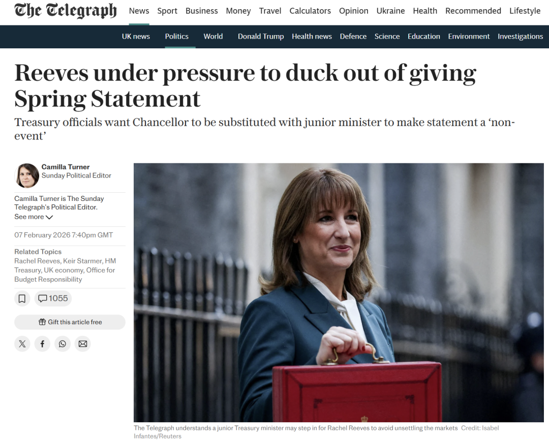 消息人士指出,这样做是为了让今年的《春季预算案》显得“低调”一些,避免重蹈《2025年秋季预算案》发布前的覆辙——当时一系列税收和支出方面的泄密、放风和政策反转曾导致投机行为和市场动荡。