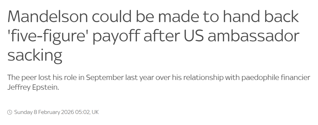 据英媒报道,英国前驻美大使曼德尔森去年9月被解职时获得的离职赔偿(估计税前高达5.5万英镑),因爱泼斯坦文件最新曝光而被重新审查。