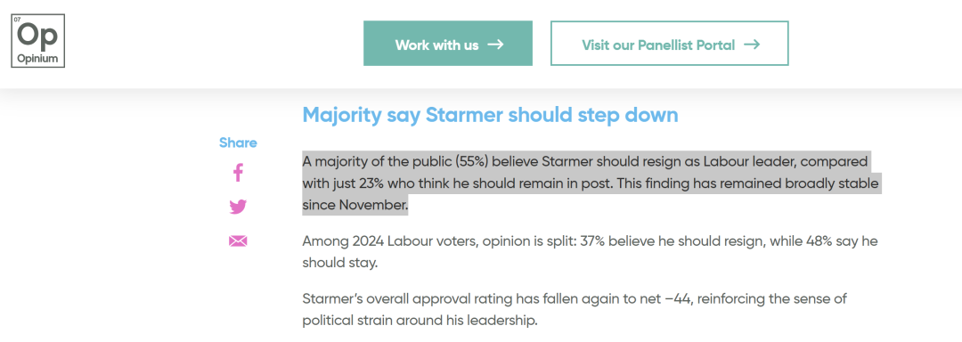 同一天的Opinium民调结果更糟糕,高达55%的英国成年人认为斯塔默应下台,37%在2024年大选中投给工党的受访者也认为他需要辞职。