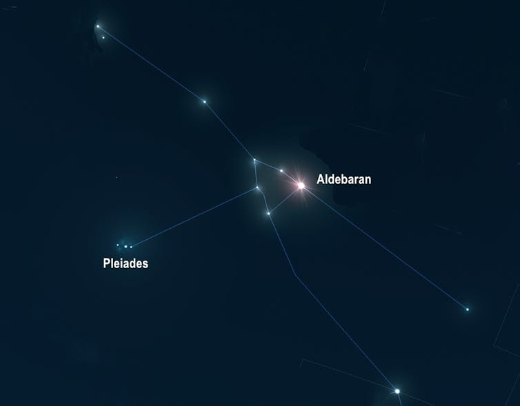 金牛座的另一个星团是昴星团。它被称为七姐妹星团,这一称呼不仅存在于欧洲传统中,世界各地的文化都这么叫,包括澳大利亚原住民文化。