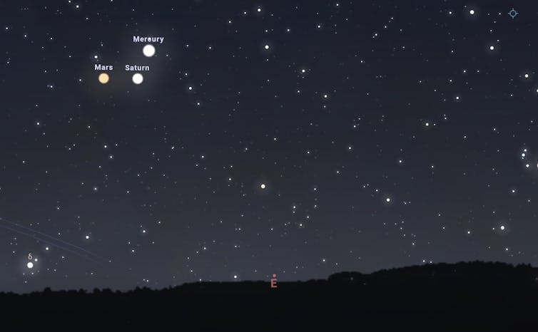 4月20日凌晨5点,水星、火星和土星将在天空中聚成紧密的一团——望向东方即可看到。(虚拟天文馆)