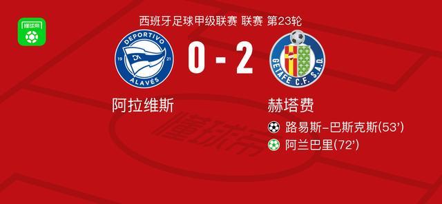 北京时间2月8日西班牙足球甲级联赛 联赛 第23轮,阿拉维斯主场对阵赫塔费。赫塔费路易斯-巴斯克斯破门,阿兰巴里破门。最终比分阿拉维斯 0-2 赫塔费。