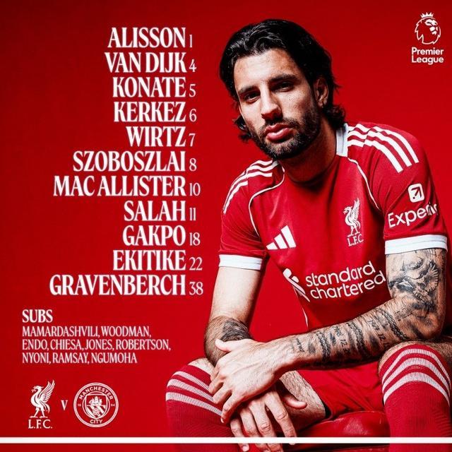 利物浦首发:1-阿利松、8-索博斯洛伊、4-范戴克、5-科纳特、6-凯尔凯兹、38-赫拉芬贝赫、10-麦卡利斯特、7-维尔茨、11-萨拉赫、18-加克波、22-埃基蒂克