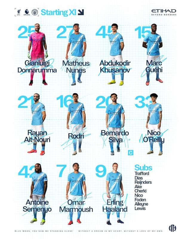曼城首发:25-多纳鲁马、27-马特乌斯-努内斯、45-胡桑诺夫、15-格伊、21-艾特-努里、16-罗德里、20-伯纳多-席尔瓦、33-尼科-奥赖利、42-塞门约、7-马尔穆什、9-哈兰德