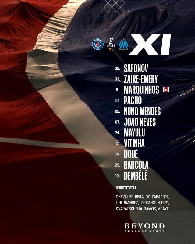 巴黎首发:39-萨福诺夫、25-门德斯、5-马尔基尼奥斯、51-帕乔、33-扎伊尔-埃梅里、17-维蒂尼亚、87-若昂-内维斯、24-马尤卢、10-登贝莱、14-杜埃、29-巴尔科拉
