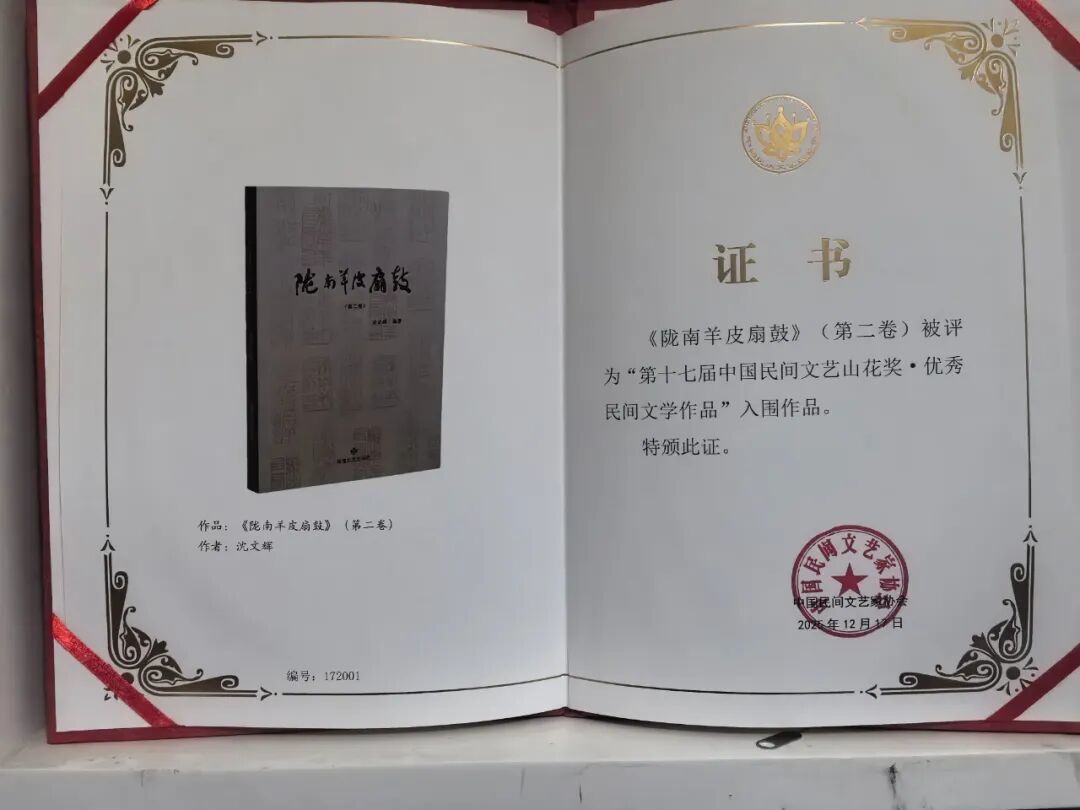 沈文辉编著的《陇南羊皮扇鼓》(第二卷)凭借丰富的内容和文化价值,再次入围第十七届中国民间文艺山花奖·优秀民间文学作品,展现了陇南独特的民俗文化魅力。