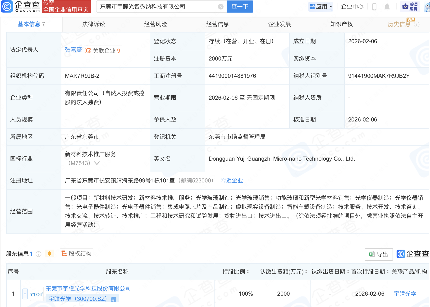 企查查APP显示,近日,东莞市宇瞳光智微纳科技有限公司成立,注册资本2000万元,经营范围包含:集成电路芯片及产品制造;虚拟现实设备制造;智能车载设备制造等。企查查股权穿透显示,该公司由宇瞳光学(300790)全资持股。