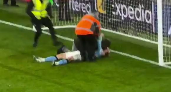 北京时间2月9日英超第25轮,曼城2-1逆转击败利物浦。本场比赛最后时刻曼城曾打进第三个进球,但这粒进球随后被判无效。在这粒进球发生后,被索博拉倒的哈兰德顺势躺在球门附近,此时一名球迷冲入球场拥抱哈兰德,随后被安保人员拉走。