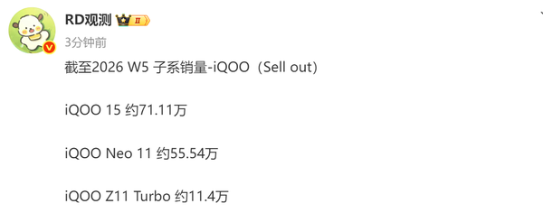 2月9日,CNMO注意到,博主“RD观测”同时曝光了iQOO旗下多款机型的最新销量(截至2026年第5周):
