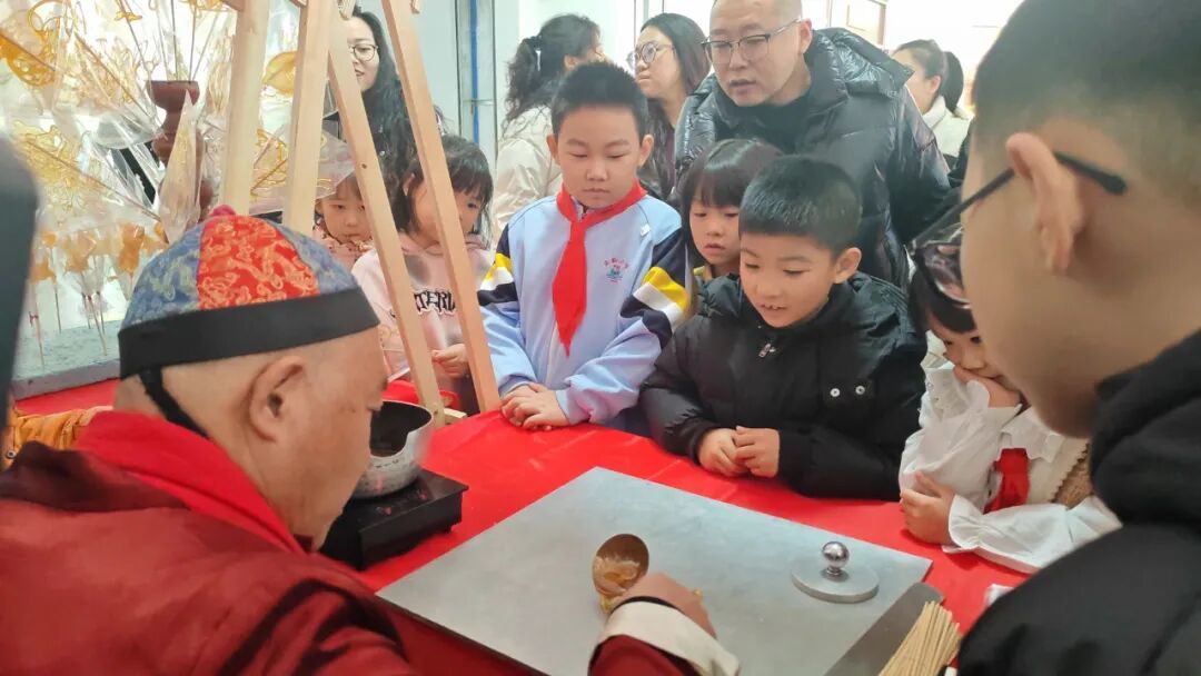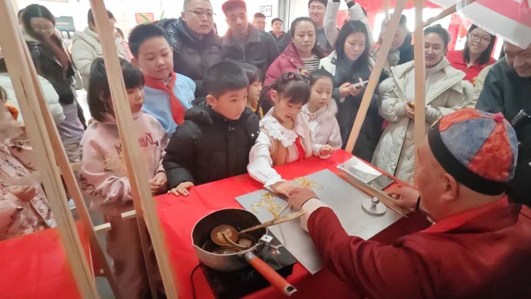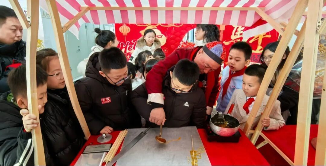 在糖画非遗体验环节,特邀的糖画世家第四代传承人侯国彬老师挥勺作画,现场展示精湛技艺,金黄糖浆在手中挥洒自如,转瞬化作骏马、生肖、福字等精美造型,让现场观众近距离感受非遗文化的神奇魅力。孩子们更在老师的专业指导下亲手制作糖画,亲手体验非遗创作的乐趣,将可看可尝的甜蜜非遗记忆带回家,实现了非遗文化的沉浸式传播。