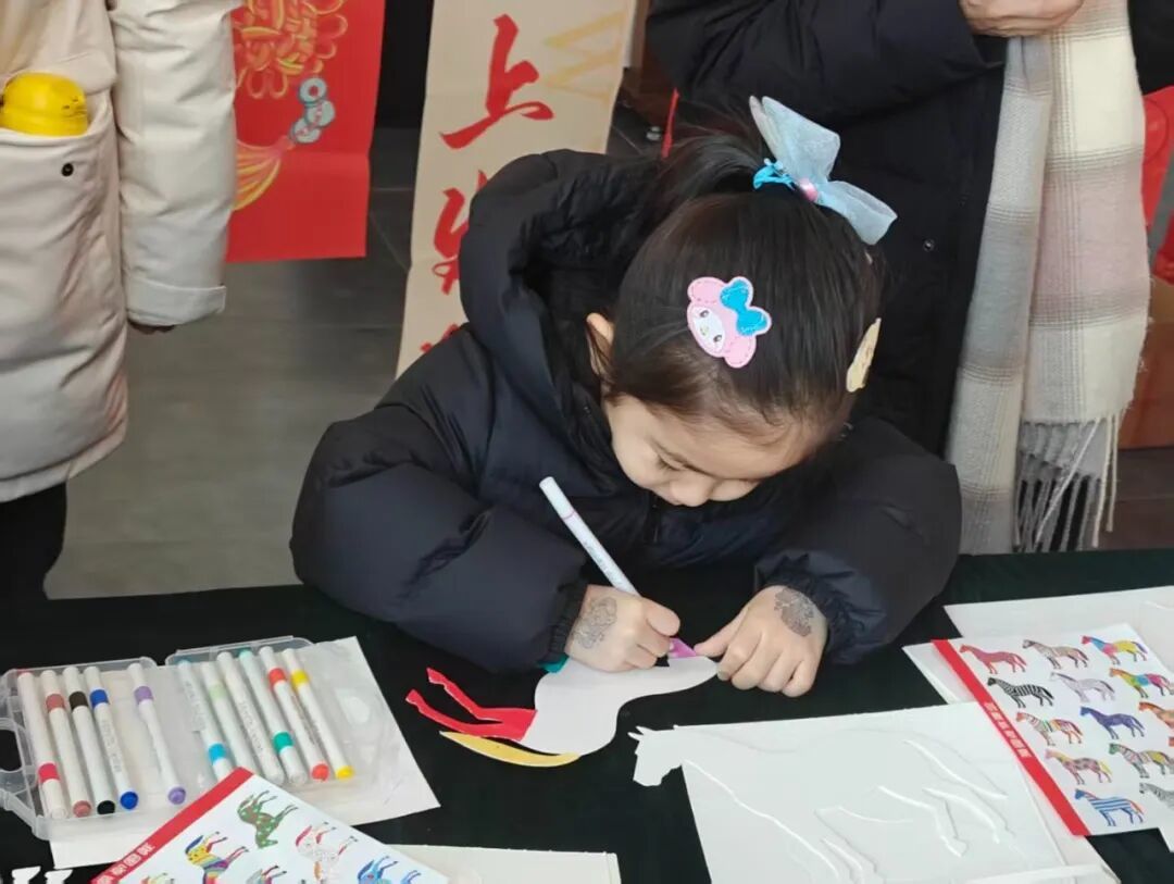 马形卡片涂鸦环节中,孩子们化身小小艺术家,在特制的马形轮廓卡片上自由创作,用五彩画笔勾勒出独一无二的 “新年神骏”,在手工创作中寄寓 “龙马精神” 的美好新年期许,既锻炼了孩子们的动手能力与想象力,又传递了传统新年文化内涵。