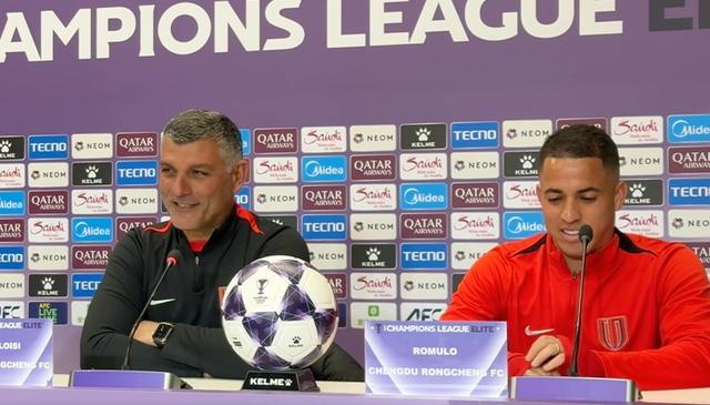 2月9日下午,成都蓉城与武里南联的赛前新闻发布会,主教练约翰-阿洛伊西和球员罗慕洛出席。