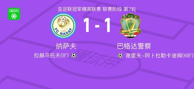 北京时间2月9日亚足联冠军精英联赛 联赛阶段 第7轮,纳萨夫对阵巴格达警察。纳萨夫拉赫马托夫破门。巴格达警察谢里夫-阿卜杜勒卡迪姆破门。最终比分纳萨夫 1-1 巴格达警察。