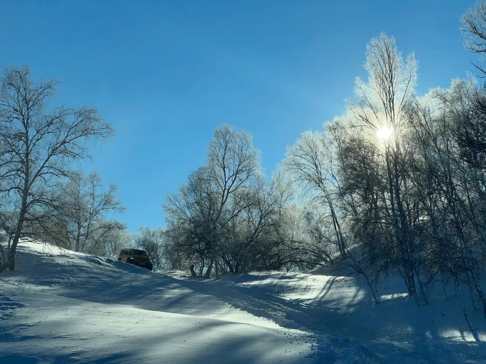 这是郭弋搏舅舅家的牧场,有1000多亩地。夏天会有十几个工人来这片草原帮忙,夜晚人们一起睡在白色平房的大通铺上。冬天绝大部分时间,此处大雪封山,路极难走,看守的人在这里一待就是两个礼拜。