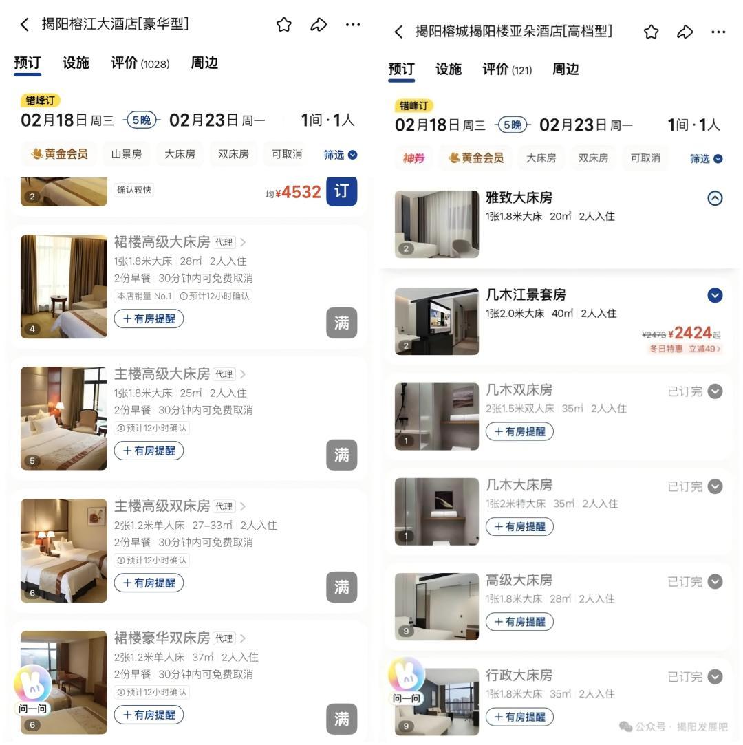 揭阳,同样不甘示弱。在美团平台搜索大年初二至初七订房信息发现,揭阳多家中高端酒店如榕江大酒店、亚朵酒店、万豪酒店、舒晨酒店等普通大床房皆显示满房订完状态,仅剩行政套房、豪华套房等少量高价客房可订。