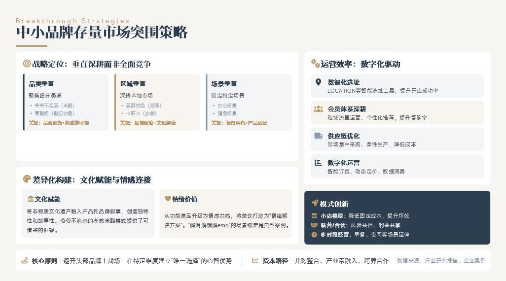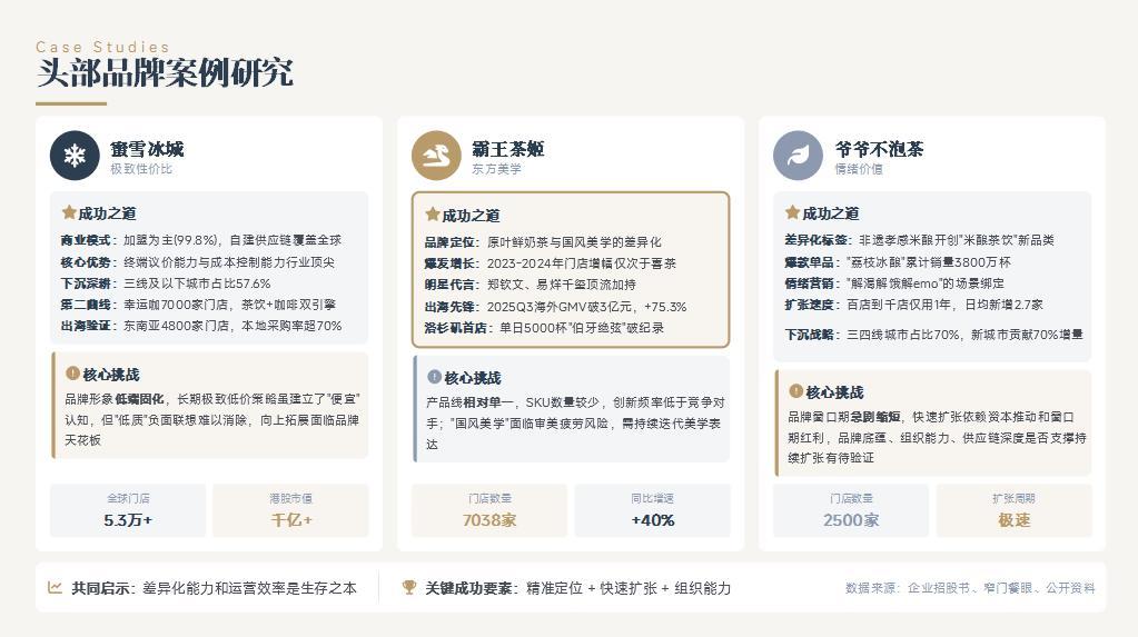 2025年中国新茶饮行业站在历史性转折点上。增量时代的狂欢已然落幕,存量博弈的残酷现实考验着每一个参与者。蜜雪冰城的极致性价比、霸王茶姬的东方美学、爷爷不泡茶的情绪价值,代表了不同维度的突围路径,但它们的共同启示是:在存量竞争中,差异化能力和运营效率是生存之本,长期主义和价值创造是穿越周期的关键。