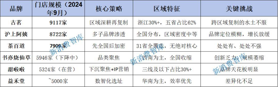 万店规模被视为新茶饮品牌的第一道"护城河"——不仅是规模效应的体现,更是供应链能力、组织管理能力、品牌认知度的综合验证。2024-2025年,古茗、茶百道、沪上阿姨、书亦烧仙草、甜啦啦、益禾堂等均喊出万店口号,但实现路径与进度差异显著。