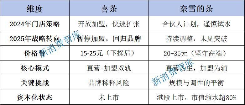 高端市场(客单价20元以上)在2024年发生显著变化。喜茶开放加盟后新开门店超2000家,但2025年2月宣布暂停加盟申请,明确"不做低价内卷",战略从"规模优先"回调"品牌优先"。奈雪的茶则陷入持续困境——2024年营收49.2亿元,同比下滑4.7%,经调整净亏损9.19亿元,加盟试点未见爆发,门店数持续收缩。