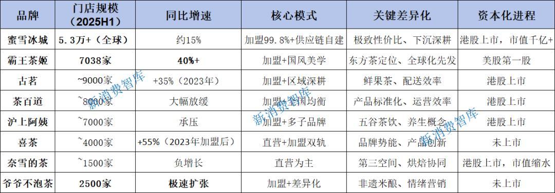2024-2025年,新茶饮行业头部品牌呈现"强者愈强"的马太效应,规模扩张与资本化进程同步加速。截至2025年上半年,蜜雪冰城全球门店突破5.3万家,较2023年末的3.4万家增长超过55%,年均净增近万家门店。更值得关注的是,蜜雪冰城于2025年在港股上市,市值突破千亿港元,成为"新茶饮第一股",资本化为其后续扩张提供了充足的弹药。
